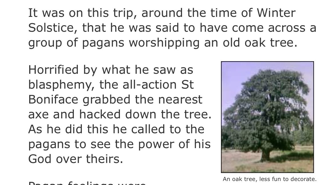 mythology, St. Boniface cut down a sacred huge living oak tree worshipped by the Pagans. Per one version of the myth, a new fir tree miraculously grew in its place & was decorated the next year by the new converts, resulting the origin of the decoration.